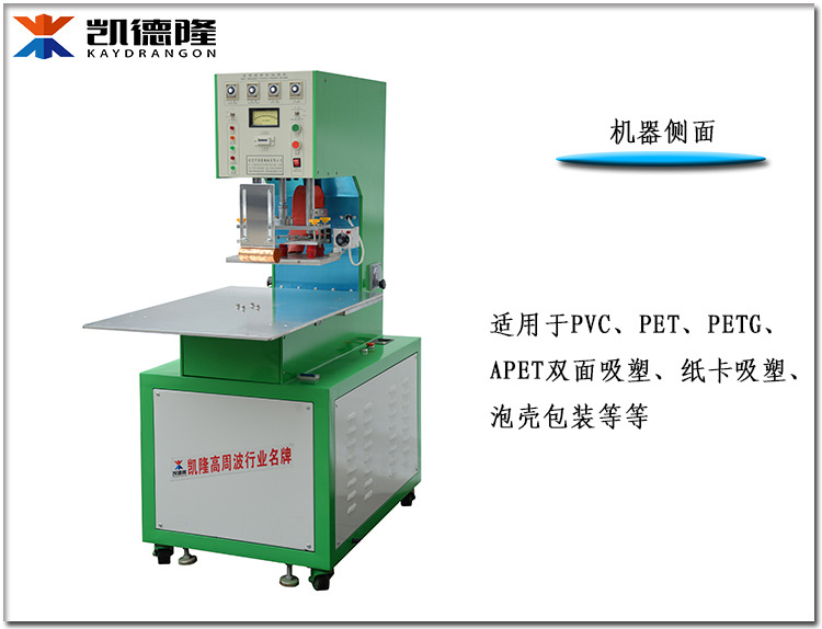 设备说明:1、采用真空电子管,输出功率稳定可靠。2、高灵敏火花过流保护回路。可有效切断因大电流输出损坏主机、压制火花。3、设有高周波频率稳定器及高周波屏蔽装置,将高频干扰降低。4、无级调节机头行程,特殊机械踏板机构压力可达400KGS。5、可根据加工需要,选择气动加压方式,降低工作强度,提升电压产品之品质。6、无级调温加热系统,让工作效率高。7、四角式水平调节、调模简便省时。8、自动过流保护系统,增加真空电子管使用寿命,保护模具。9、4kw40.68MHz。5—12kw27.12MHz国际标准工业波段。