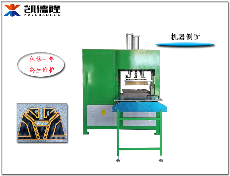 高周波电动车脚垫压花机设备说明:1、周率稳定;采用国际工业波段27.12MHZ,输出周率稳定,符合国际工业波段标准。2、输出力强:低损耗同轴振荡器,同调调谐器,输出力强缩短熔接时间,提高产量。3、安全性能;无论是突然遇到停电还是停气时,机器都是静止状态,不会突然上升或下降;提高工人操作安全问题。4、高速同调器;依产品的大小和物料厚度调节,能大大地降低必要之熔接时间,提高机器之生产量。5、防干扰装置;配置有频率稳定器及高频磁场屏蔽系统装置,将高频干扰降低。6、加固式机架;平稳耐用。7、加热功能;适用不同产品加工需要。8、进口配件;重要的配件均适用日本、俄罗斯、美国以及台湾的正品电子原件。9、左右推盘操作;适用于较大尺寸的塑料(塑胶)产品热合焊接或者封口。